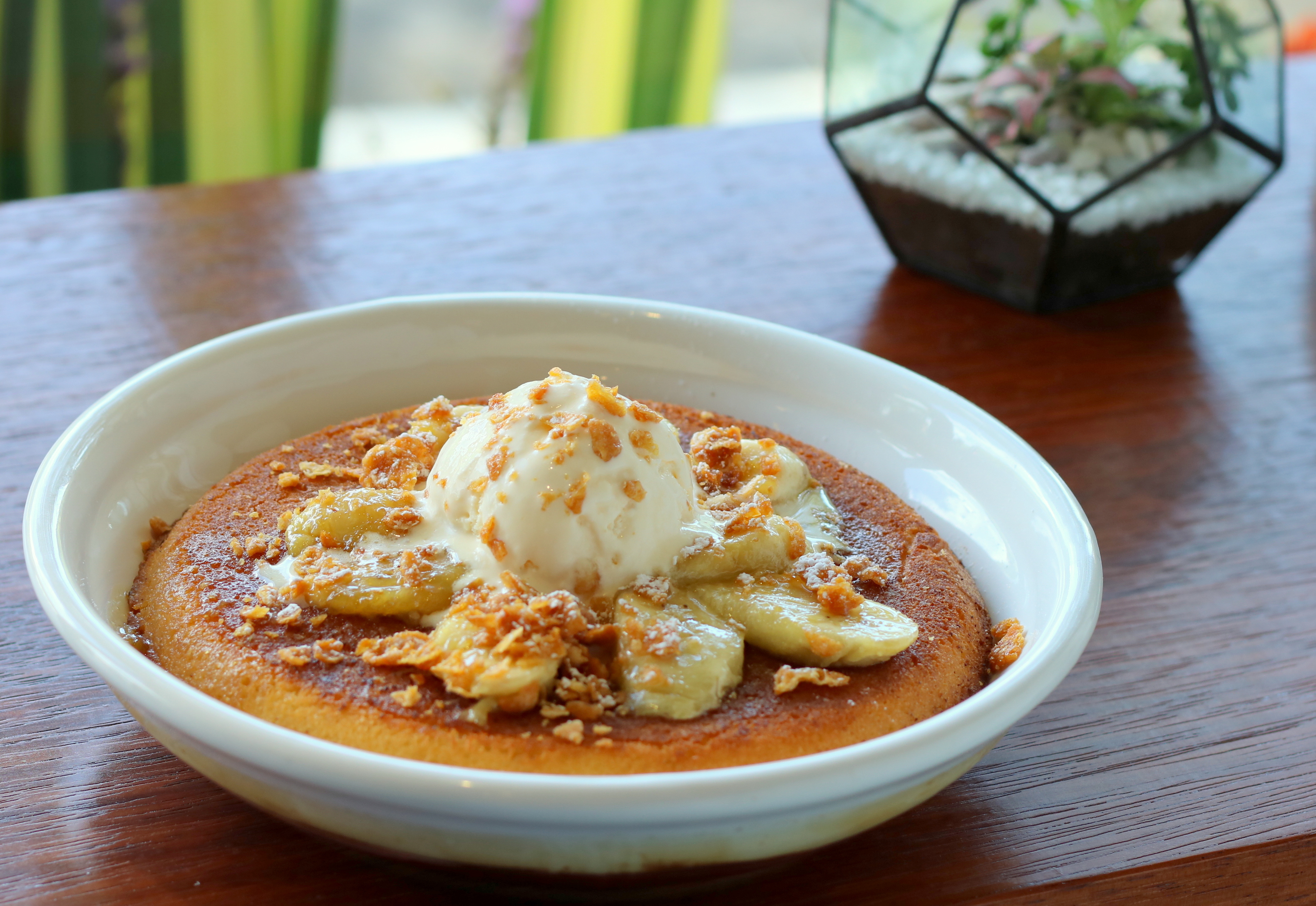 In the mood of trying something savoury and sweet, we settled for the Creamy Mushroom on Sourdough ($12) and the ATLAS Butterscotch Banana Pancake ($18).