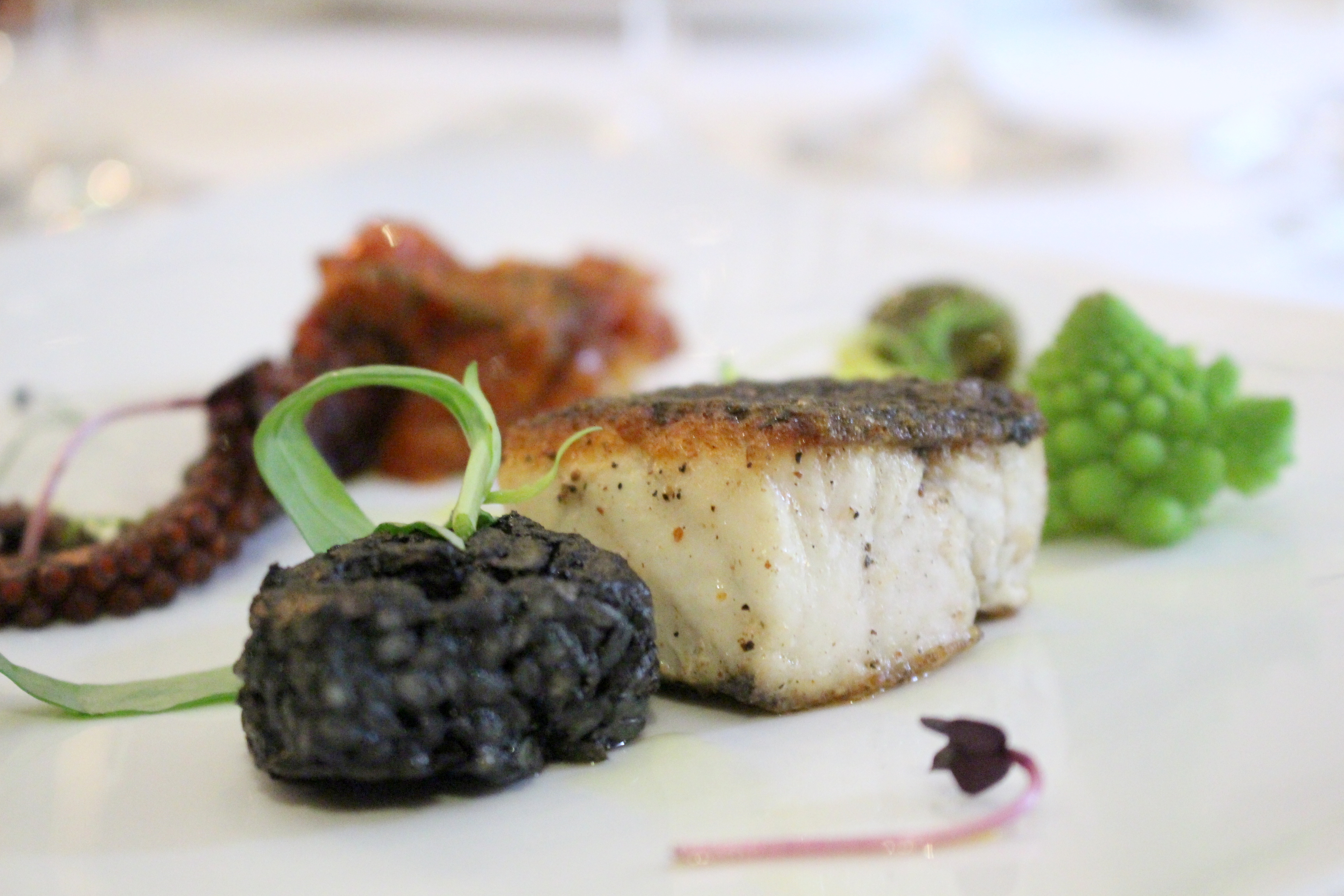 The grilled sea bass and octopus has a strong ocean theme in its presentation.