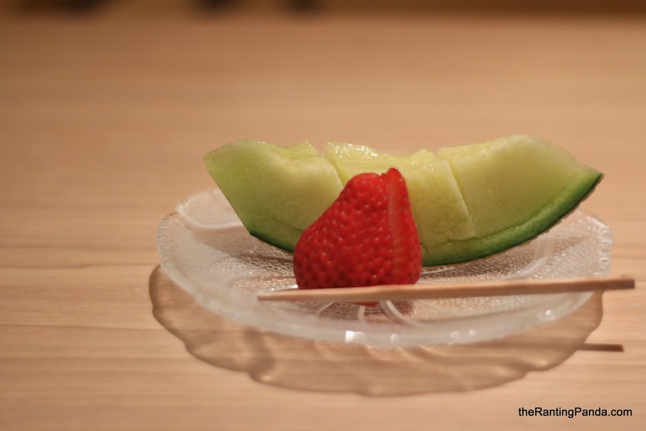 For most traditional Kaiseki meal, it usually ends with Matcha and Japanese Sweets. We had the melon and strawberries from Shizuoka Prefecture, along with Matcha whisked by the chef.