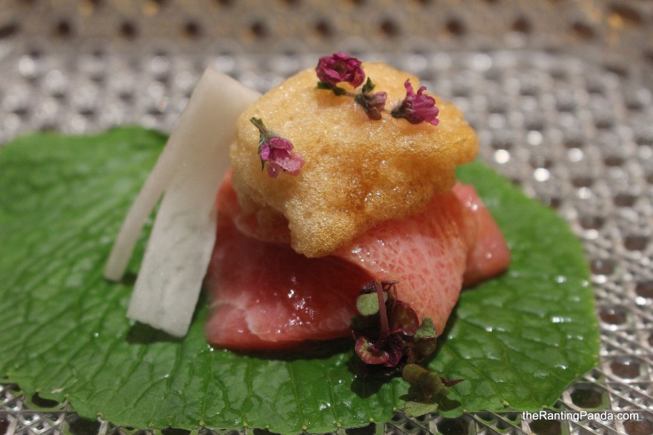 One of the highlights for me was the sashimi course where I tried the Tai and Maguro, of which my favourite was the Maguro sashimi (Chutoro and Otoro). I really enjoyed the fine touches of the whole presentation even though it is just one part of the multi-course Kaiseki meal. The fatty Maguro slices were served on wasabi leaf, topped with a deceptive Uni-lookalike soya sauce foam. Every bite was bliss.