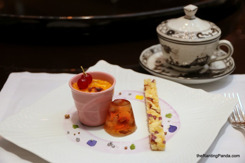 Finally, our dessert is the Sweet Potato Dessert Trio, a combination of Hot Sago Pudding, Crunchie Potato Bar and Chilled Osmanthus Jelly. Start with the Chilled Osmanthus Jelly for a refreshing palate cleanser, followed by the Hot Sago Pudding and then the Crunchie Potato Bar, which has the sweetest and richest taste in this trio.