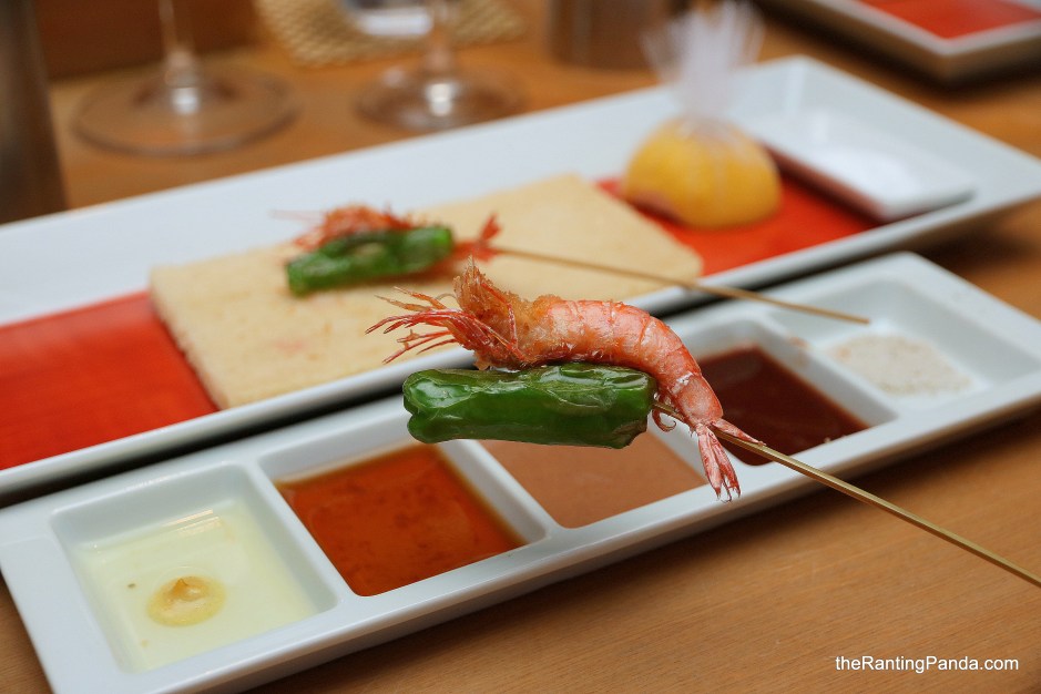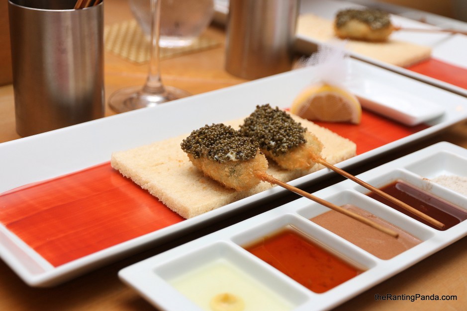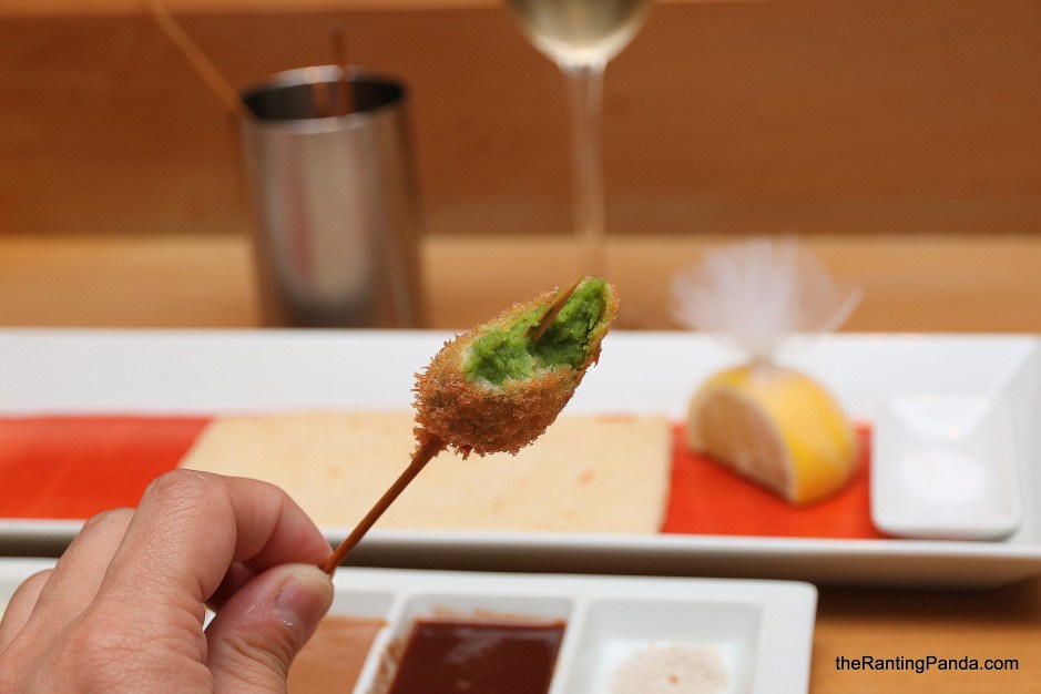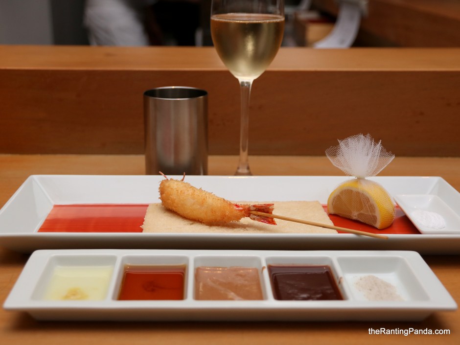 All the skewers are lightly battered and prepared ala minute, with good intervals in between. The chef will check on each diner regularly and each skewer gets a short brief introduction when served. The four dips served include Lemon with a drop of mustard, Shoyu, Sesame with Wasabi and Red Wine sauce, as well as Japanese Salt and Pepper. The skewer will be placed with the stick ends pointing towards the recommended dip, and you should follow it conscientiously for the best flavour. My favourite dip is the Shoyu and Red Wine sauce though.
