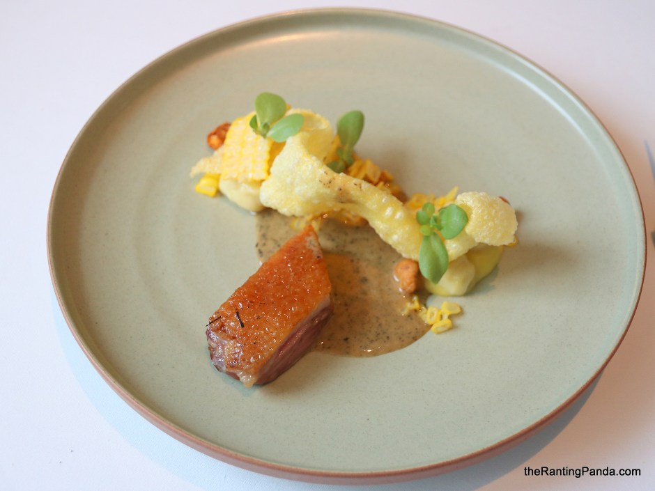 Our favourite dish in this whole beautiful gastronomic journey is this dish – Degustation of Corn with 20 days Dry Aged Challans Duck. Challans Duck is a breed of French duck, often regarded as one of the most tender duck breed. Chef wanted to create a dish high in protein here, and who would have thought that the tender duck meat would go so well with corn? The overall flavour of this dish is amazing, with a subtle hint of smokiness as we savoured the duck meat bit by bit.