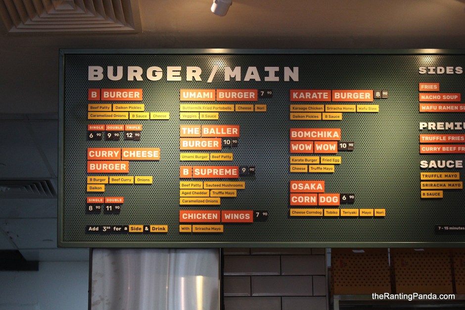 The Food Unlike the usual fast food chain neighbours at the same mall, B Burger does not serve up its burgers in a typical set meal. Of course, if you are craving for a drink, or a side, these are all available on for orders too – just add S$3.50 for a side and drink.