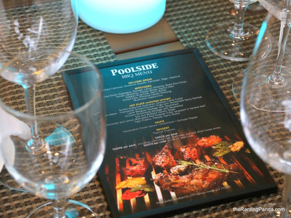 The Place Poolside dining seems to be a popular concept by hotels in Singapore, which is a good complement to the existing restaurants within the hotel property. The latest hotel to introduce poolside dining is Pan Pacific Singapore’s Poolside Patio, an alfresco dining concept adjacent to the refurbished swimming pool and Poolside Bar. Available only on Friday and Saturday nights, the concept is a four-course barbecue menu.