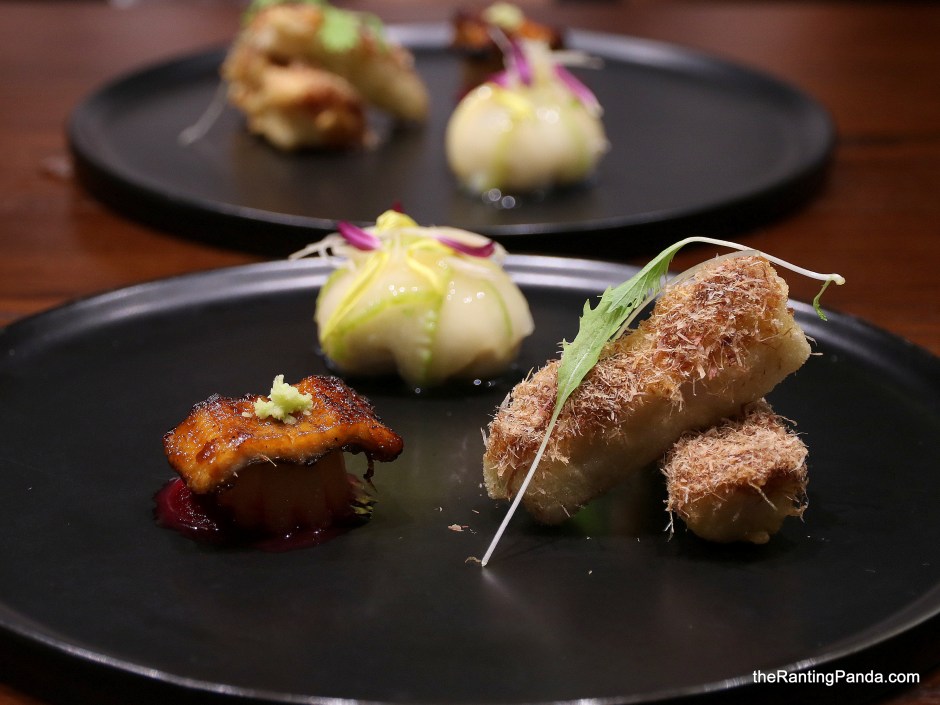 The Seasonal Hassun (S$32) is a Japanese inspired dish, also a traditional kaiseki starter. The combination changes periodically, on frame here is a trio of Lotus roots with Tempura batter with bonito flakes; Tofu and scallop blended together wrapped with winter melon; Unagi with daikon and beetroot purée topped with wasabi. The tofu flavour is very fresh, while its texture is silky, not withstanding that the Unagi itself is very delicious too.