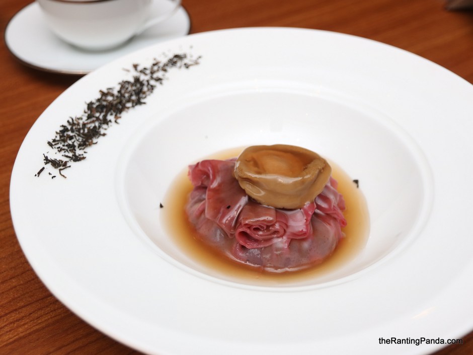 Next up on the degustation menu is the Braised Fresh Abalone, Treasure Dome with Egg Skin and paired with Lychee Red Tea. I love the plating of this dish, subtle yet suggestive of the tea elements in the dish. While the fresh abalone takes centrestage here, the red hue of the skin from the lychee tea is equally captivating.