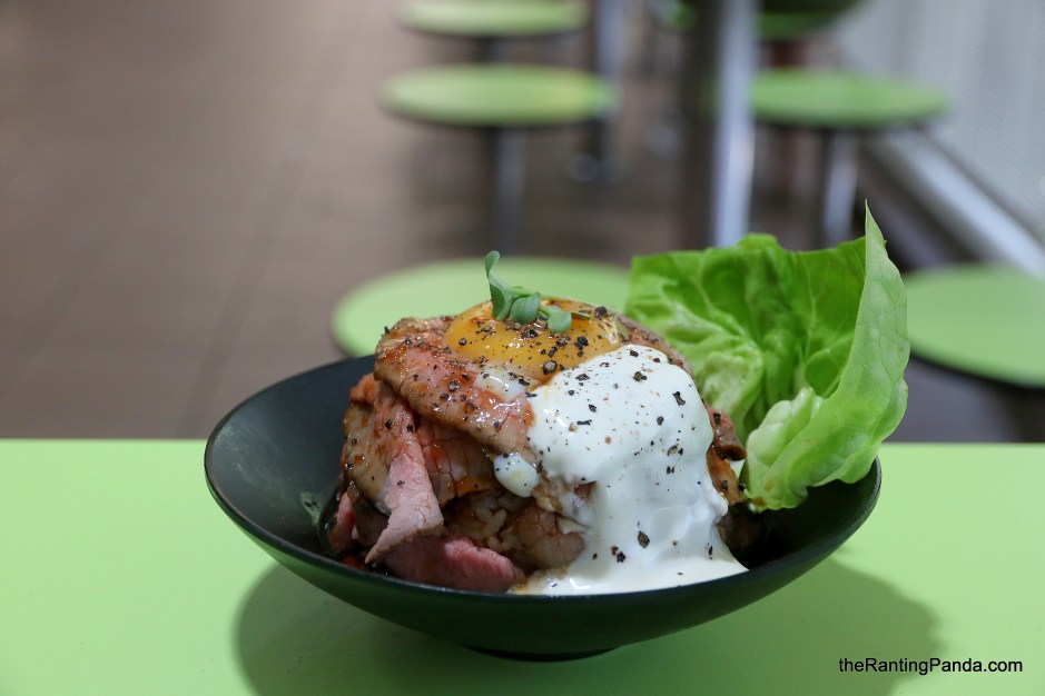 As I watched my Beef Donburi being prepared, the chef wraps the thin slices of the eye round beef around the mini mountain of Japanese rice, before compressing a little at the tip to make space for the onsen egg. Some secret black sauce is then added, before the homemade yogurt sauce is being squeezed at the side of the bowl.