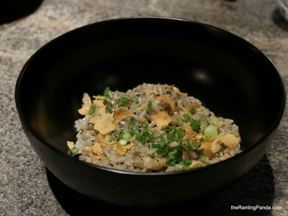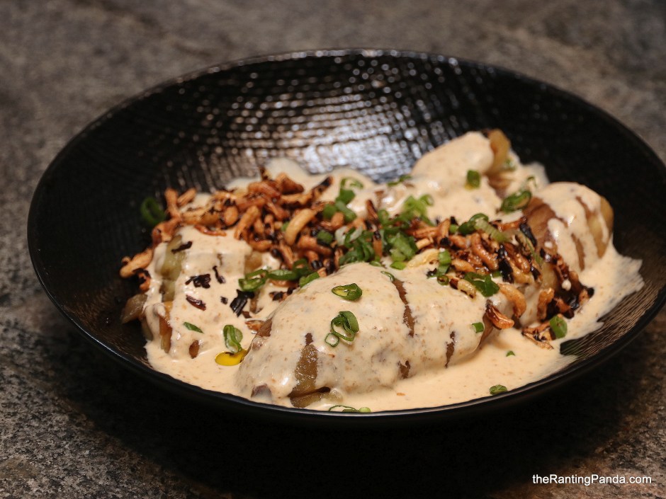The Binchotan Burnt Aubergine (S$12) has a queue combination of yoghurt and white sesame dressing with Japanese chilli oil, which works well surprisingly. The dish is then garnished with deep-fried wild rice grains.
