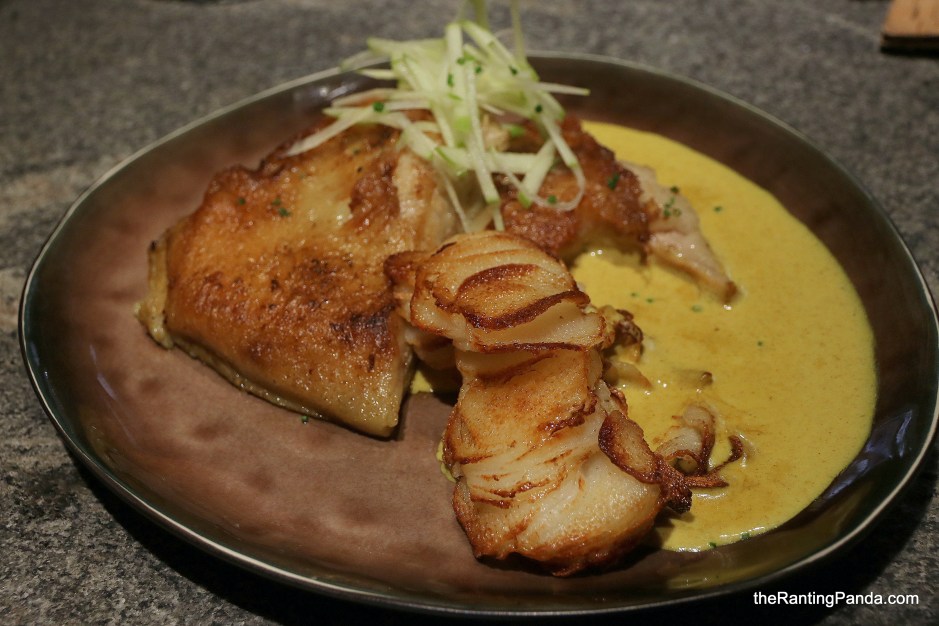 For mains, the Char-Pork Jowl (S$35) is one of Chef’s signature dishes. The presentation looks like a simple Japanese curry dish, and I can understand why this is one of the signatures. The pork jowl is very tender as it is slow cooked with duck fat for a few hours before being grilled on binchotan. The pork flavour works well with the mildly spiced curry sauce which has elements of white wine and mashed green apples. To balance the dish, thinly sliced nagaimo is served by the side.