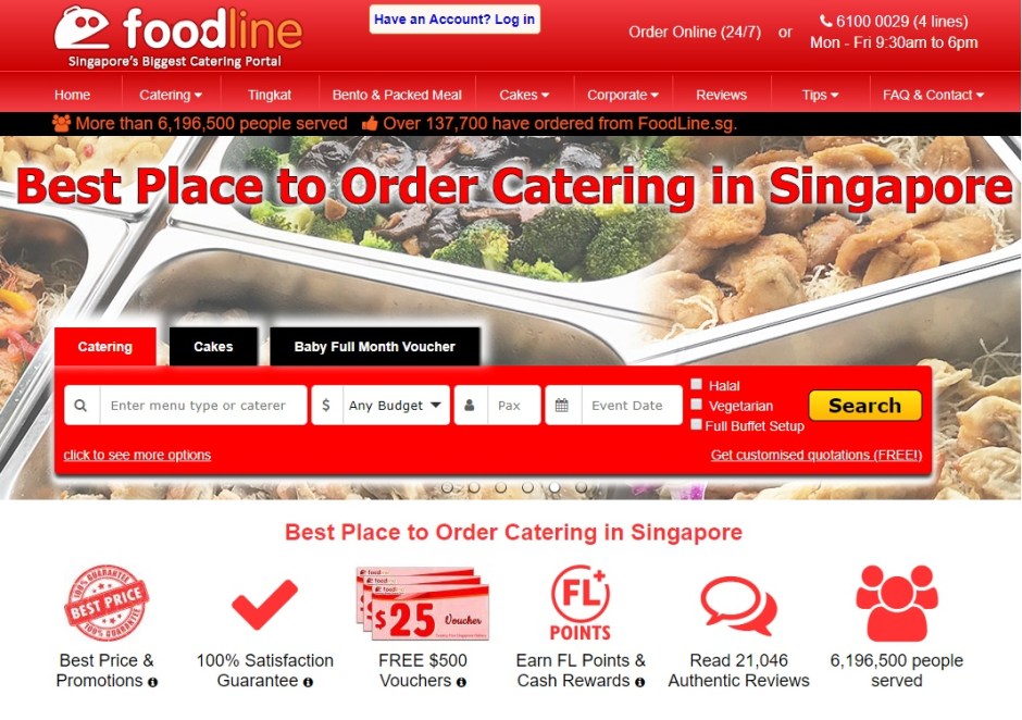 FoodLine.sg is the ultimate search engine for food catering in Singapore, with over 265 caterers. Just enter your budget, event date, no. of pax for the party, and should you require, a Halal or Vegetarian food selection, which the portal will filter out the available caterers based on your customised requirements.
