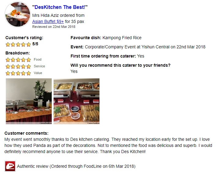 We always ponder if caterers can deliver on their promise, and that’s frankly the best feature of FoodLine.sg in our opinion. Customers of each of the food caterers are encouraged to leave feedback across perimeters such as Food Quality, Service Standards, and Value-for-Money matrices for their chosen caterer. Customers can provide further insights on their favourite dish, and their event details, to allow fellow customers to better understand the fit of the caterer for their own events. FoodLine.sg has now amassed more than 20,000 reviews on their portal to date.
