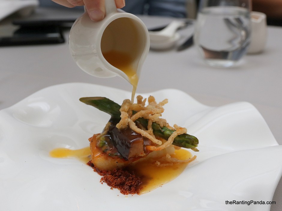 In comparison to the chicken, I enjoyed the Chilean Seabass (S$32 – 智利鱸魚) more as the flavours are more distinct for me in this dish. The pan-seared seabass is served with soybean crumbs, deep-fried enoki and and “Yu Xiang eggplant”; an iconic Szechuan dish consisting of eggplant and shredded pork tossed with garlicky pickled red pepper sauce. This is not all, as I poured the accompanying sour and spicy soup over the fish to complete the flavours. The texture of the seabass is just right, along with crunchy bits of the enoki and soybean crumbs which add more layers to the dish. As for the presentation of this dish, it is truly fine dining fashion.