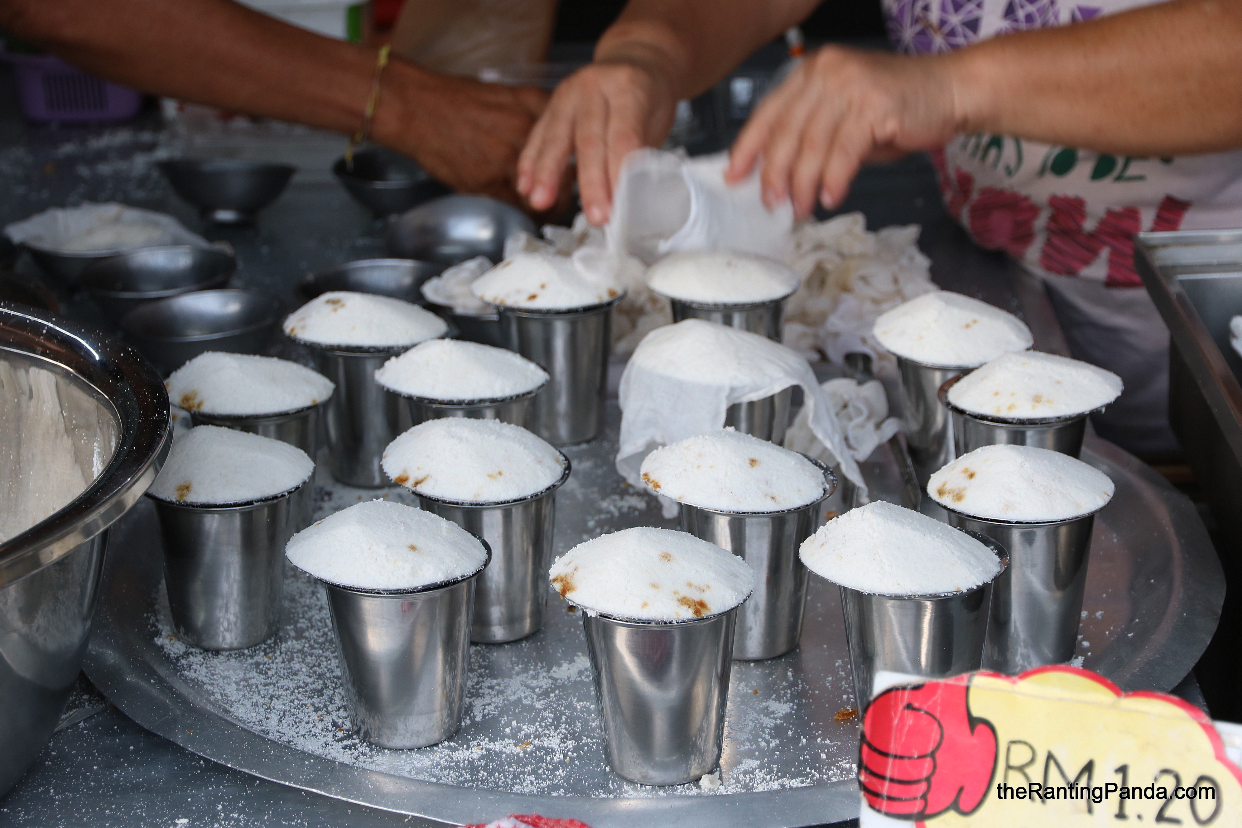 The Food Priced at RM1.20 each, the size of the Putu Piring is much bigger than the ones from Haig Road Putu Piring in comparison. Gula Melaka and coconut are added to the rice flour, and then steamed over pandan leaves to give it the nice aroma. Most people end up buying in boxes of 8 or 10 after an average waiting time of about 30 minutes as the Putu Piring are all freshly made upon order.