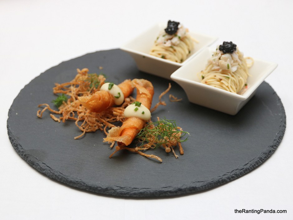 I started with some complimentary amuse bouche for all diners, Cold angel hair pasta with truffle oil, crab meat and caviar, and the crispy salmon beignet.