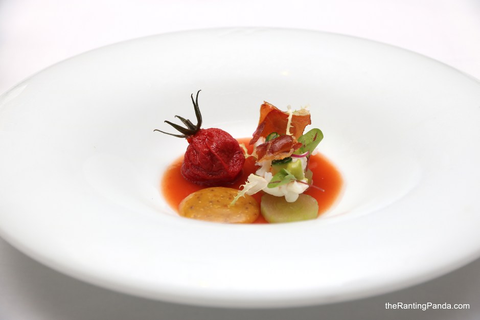 The first course proper is the appetiser, Chilled Langoustine and Prosciutto with compressed Cucumber, Tomato and Mango Mustard Vinaigrette.