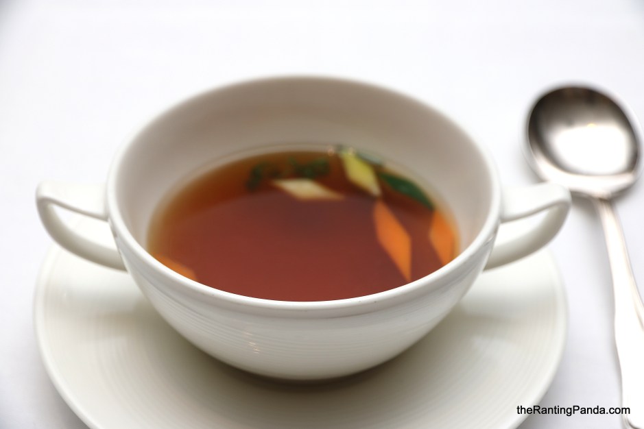 The second course is a soup dish which is the Poultry Consommé with vegetables slow cooked and made from scratch with chicken. This clear soup is comforting and simple, nothing very fanciful but is a good balance to the heavy mains next.
