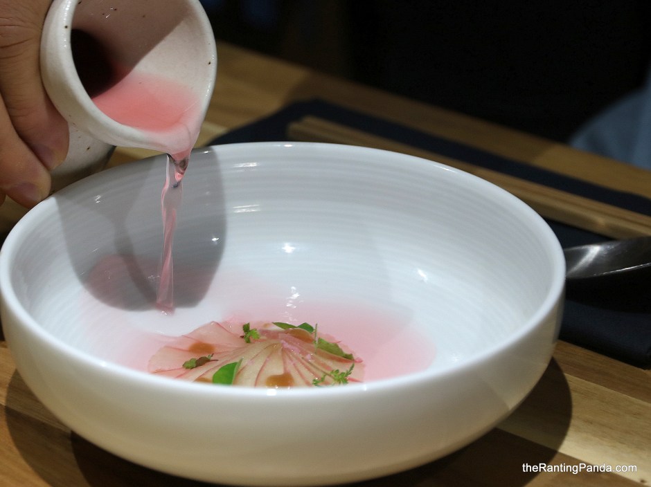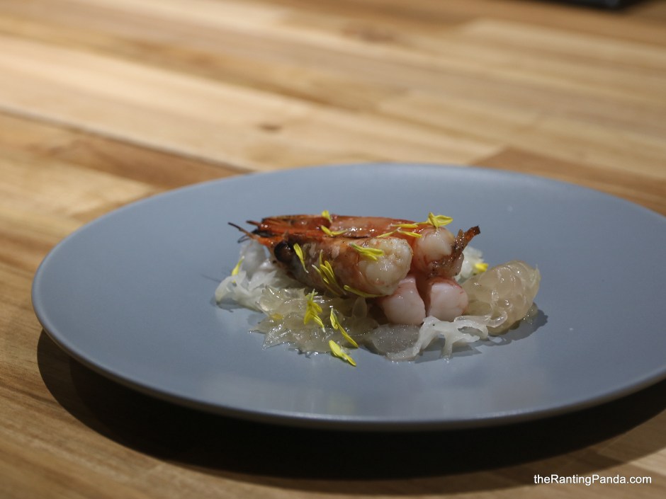 Next up is the Grilled Prawn heads with chrysanthemum and pomelo, where the sweetness of the Japanese amaebi is evident. The chrysanthemum is also infused with wild flower honey so there’s a tinge of seeetness in the yellow petals as well.