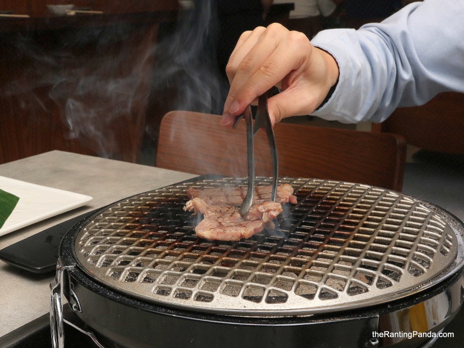 Moving to the highlight of our dinner, we started with the Hon Misuji (S$24). This chunk tender cut is the part behind the shoulder blades of the cow, and it turns out to be surprisingly good. I’m estimating the portion to be between 100-150g of six beef slices here, which goes well with the beef sauce, a little lemon and some truffle salt. It is definitely not that fatty itself, and the flavours are best brought out with the condiments. The way to grill the meats is to first smear the beef fats on the grill!