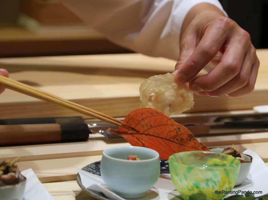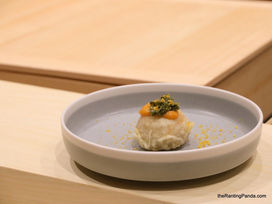 The next course is a dumpling looking tempura filled with yam. The tempura is topped with my favourite sea urchin sauce, fried seaweed along with some shaved bottarga. You get the light tempura batter here, but I would say the highlights for me are the luxe toppings.