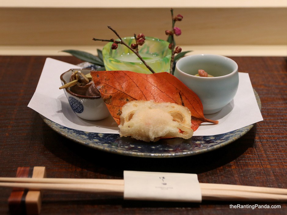The first series of starters is a trio of Kyoto style turnip soup, tempura lotus roots and cabbages.