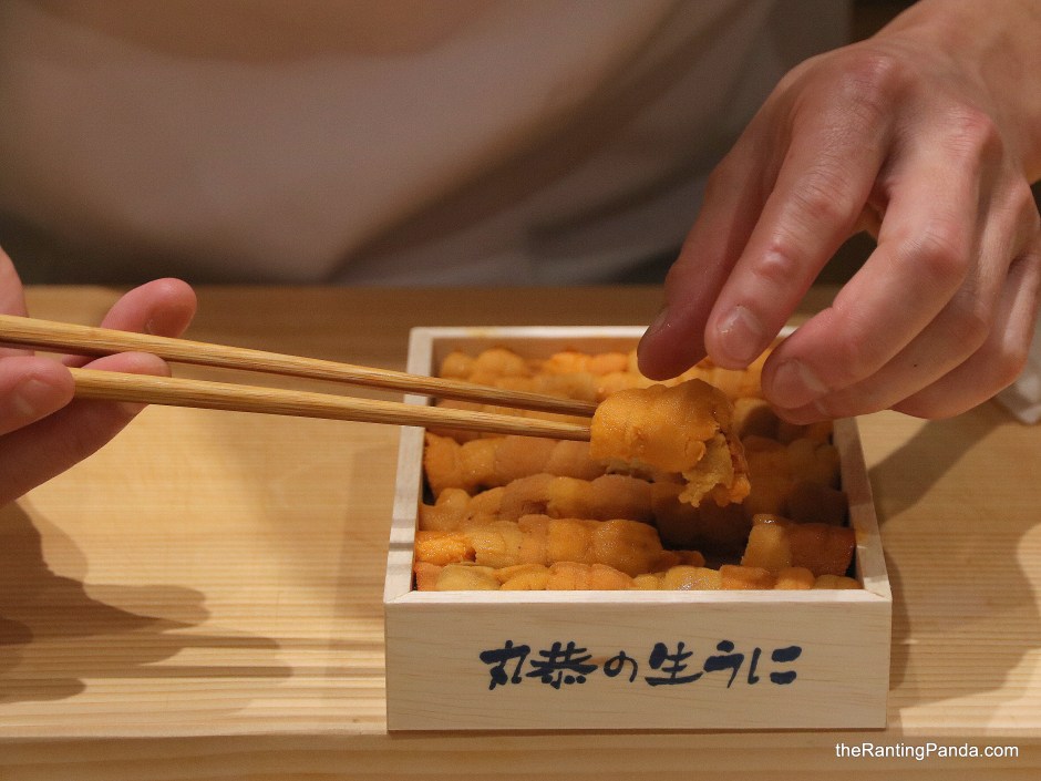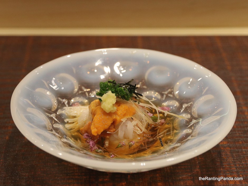 The next course is a break from sushi, but it turned it to be one of my favourite courses of the meal. It is a noodle dish, specifically Japanese yam noodles mixed with thin and deftly sliced white sheets of squid. The noodles is then topped with fresh sea urchin, before chef added some dashi broth to it. The broth makes the dish a comforting one, which is a good break for the palate after having a series of raw dishes. Needless to say, the yam noodles is delicious.