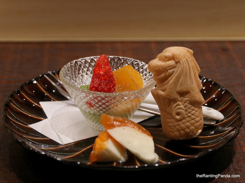 For desserts, it is a simple platter of fruits, ice cream and a Merlion looking wafer loaded with kaya spread.