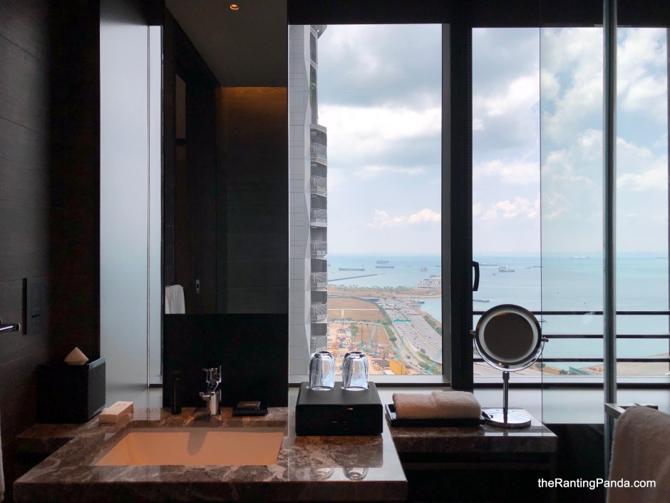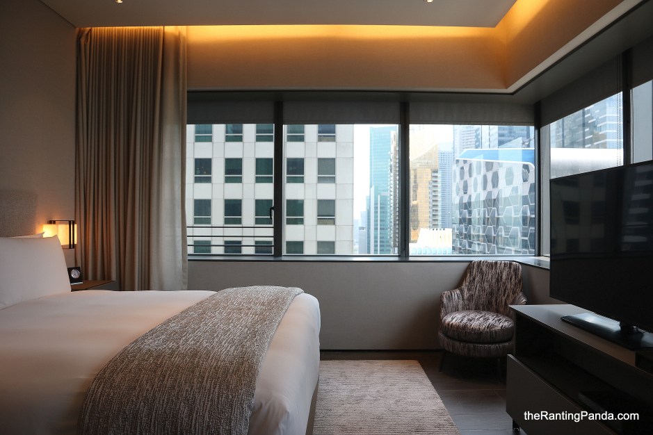 The design of the bedroom is a pleasant surprise for me. Spotting a contemporary interior with neutral colour tones, I like the ample natural light in the room from the full glass window panes, which offers a view of the Central Business District. The bed is firm enough for me, as well as the pillows where I had a good night sleep. There is also a Samsung mobile phone and tablet in the room which guests could use to surf the internet.