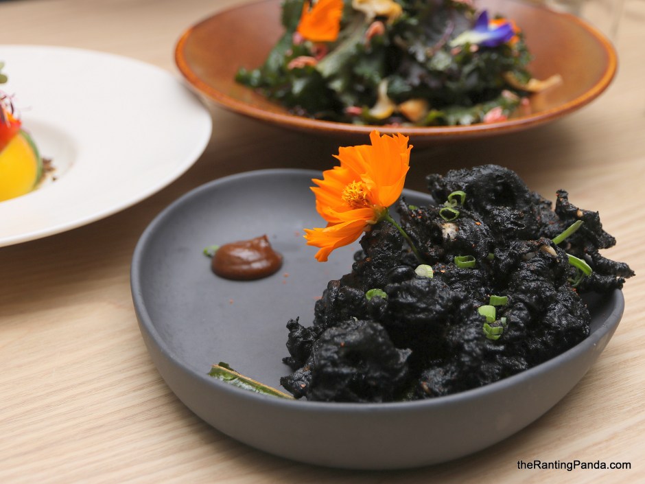 Other bar bites inspired starters I had include the Kampong Yakitori (S$12), where you get charcoal grilled chicken thigh with Edible Garden City mushrooms; and the Charcoal Calamari (S$15), a crispy texture of squid ink tempura with Japanese garlic aioli which I really love.