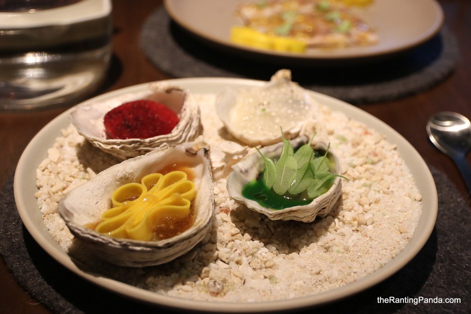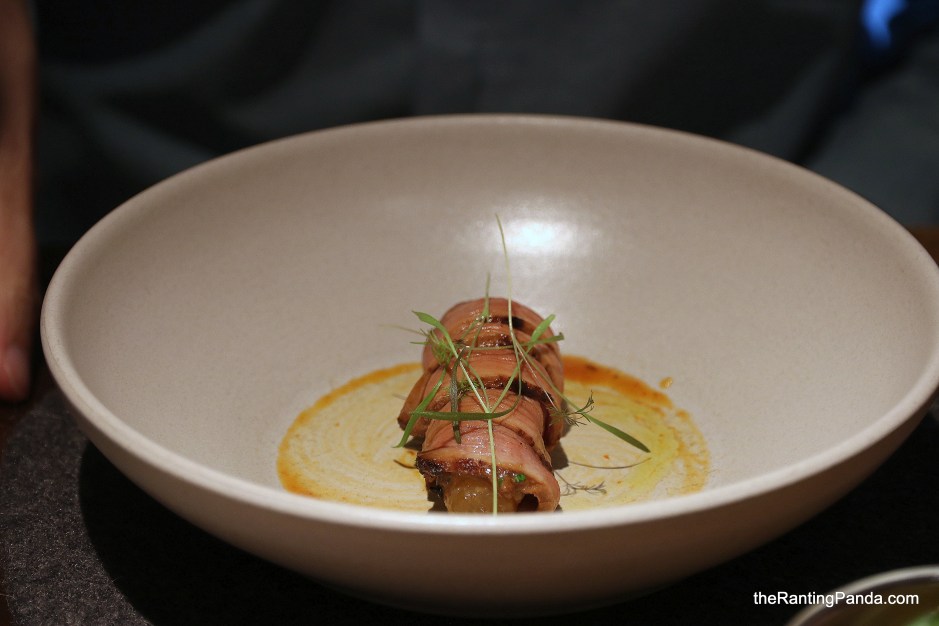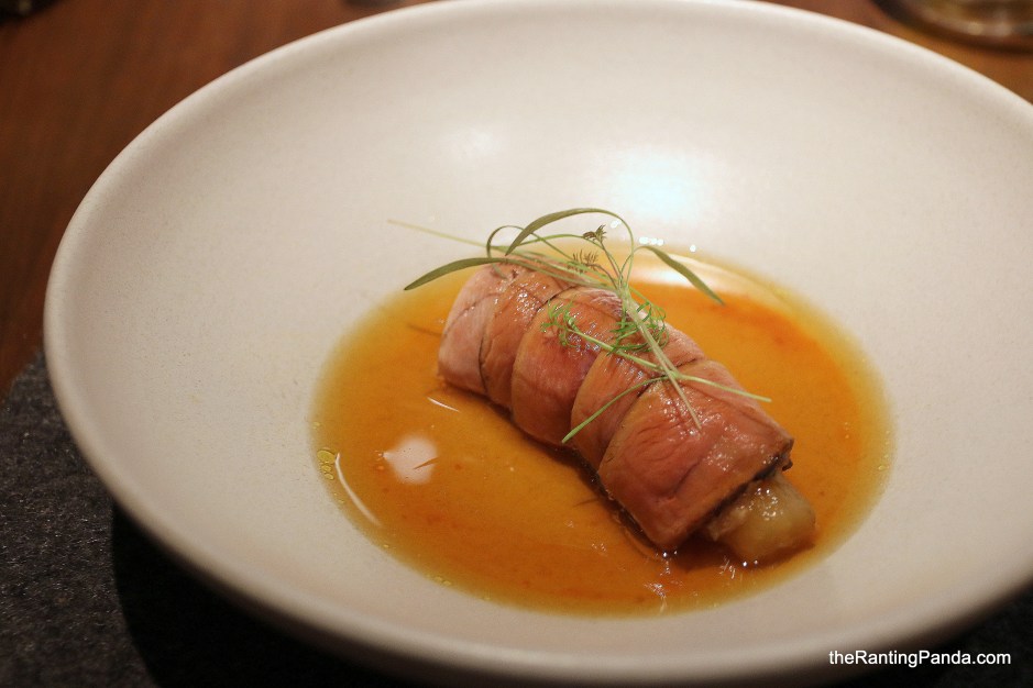 The third course is quite interesting. Oysters were served and they are decorated with various colours with seaweed sauce, pomelo with Peruvian tiger’s milk sauce, Taiwanese hibiscus, and pumpkin with kamquet sauce. One ingredient but four very distinct flavours to complement the fresh oysters, a very smart way to showcase the potential of the kitchen in one course.