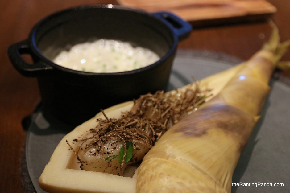 The fifth dish reminds me of Swiss cheese fondue. While it looks like bone marrow, the star ingredient here is local bamboo shoot which is sliced into bite size to resemble potato. You then dip the bamboo into the fondue which has a strong peanut oil flavour. Another pretty novel course with a very strong Asian flavour profile.