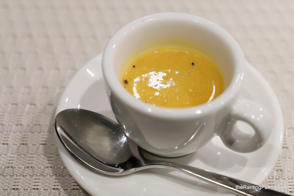 Next up is a series of appetizers, starting first with the Cream of Butternut Pumpkin served up in a shot glass.