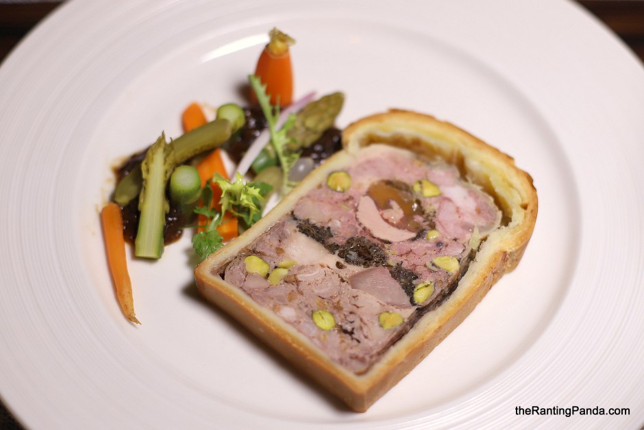 The meal started with a series of cold and hot starters. First up was the Pâté en Croûte (S$34), a mix of foie gras and pork terrine within a pastry along with pistachios, herbs and onion compote.