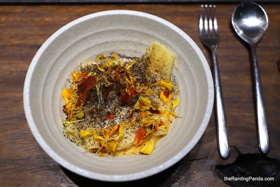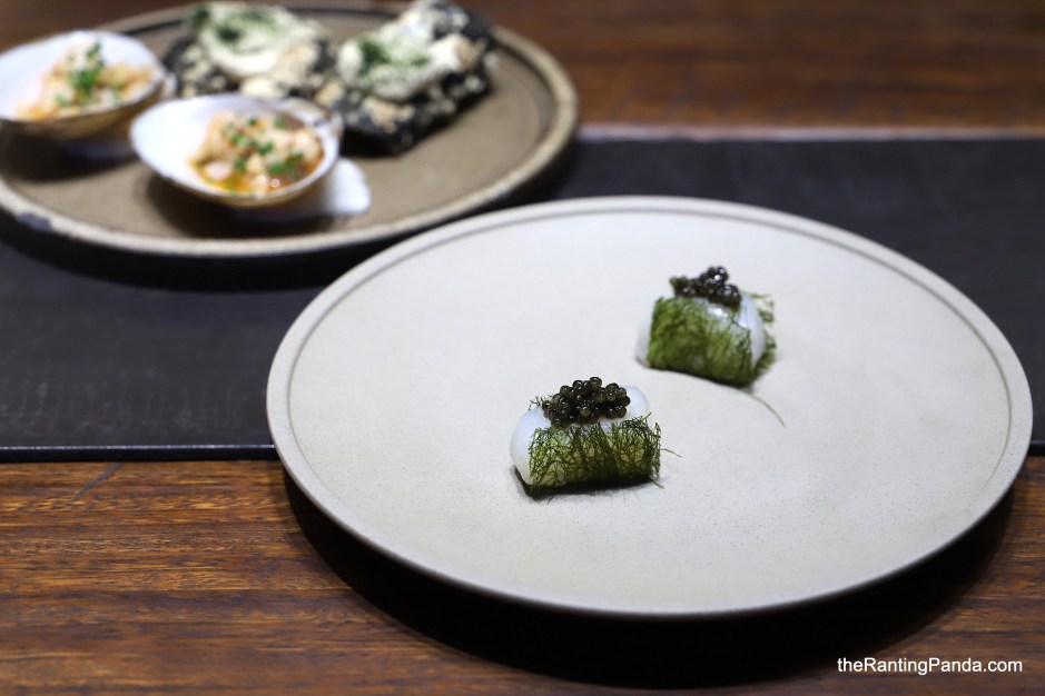 I went for the 7-course Menu. Off to a good start with a trio of Starters –  Scallop with Siberian Caviar, Seaweed Cracker with Kombu Cream, Storm Shell Clam with XO Chilli & Red Vinegar. I really enjoyed all of them, which sets the tone of the meal I anticipated thereafter.