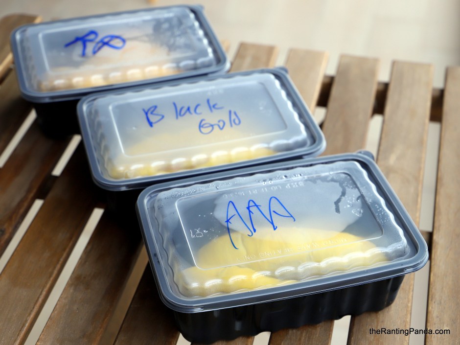 I managed to try three types of durian recently, the most premium being the Black Gold (S$27/kg). This has an intense bitter flavour, characterised by its rich custardy and creamy orange-red flesh. It will definitely get you hooked once you start. An ideal offering for the most sophisticated and delicate taste buds, and is indeed the highest grade of durians. Think of this as an enhanced version of the premium Mao Shan Wang.