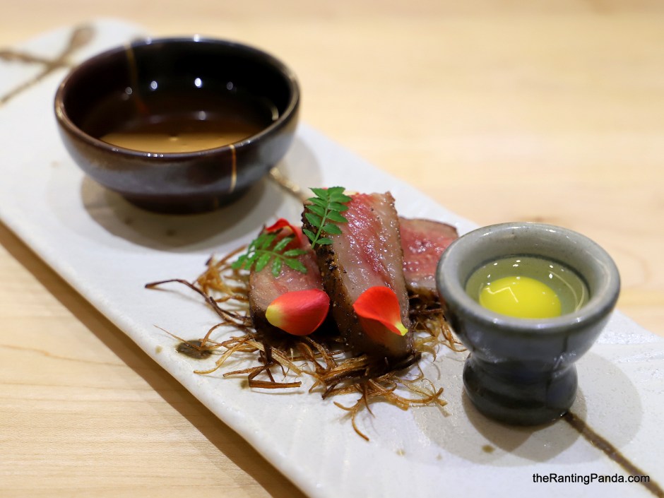 This course is easily one of my favourite. It showcases a beautiful Miyazaki A5 Wagyu Beef in three slices. What’s interesting in the presentation is that it is served in a sauce, and a small cup of quail egg yolk. The way to enjoy this dish is to pour the egg yolk into the sauce and mix well, before dipping the succulent Wagyu beef in the sauce. The overall flavour is full of umami.