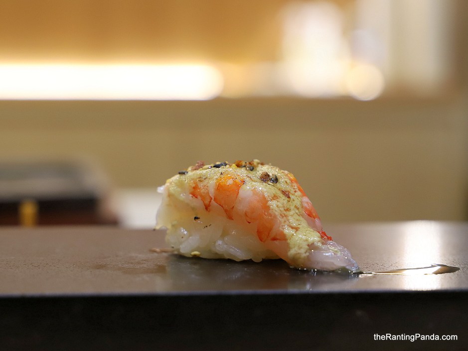 The second sushi is Aburi Amaebi with Foie Gras sprinkled with grated yuzu zest. Similarly, the prawn is torched so the foie gras simply melts and form a layer on the prawn.