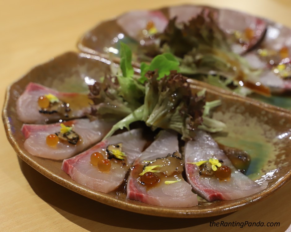 The next course is a Carpaccio dish, and I had the Kanpachi (amberjack) Carpaccio topped with Truffle and Ikura (salmon roe).