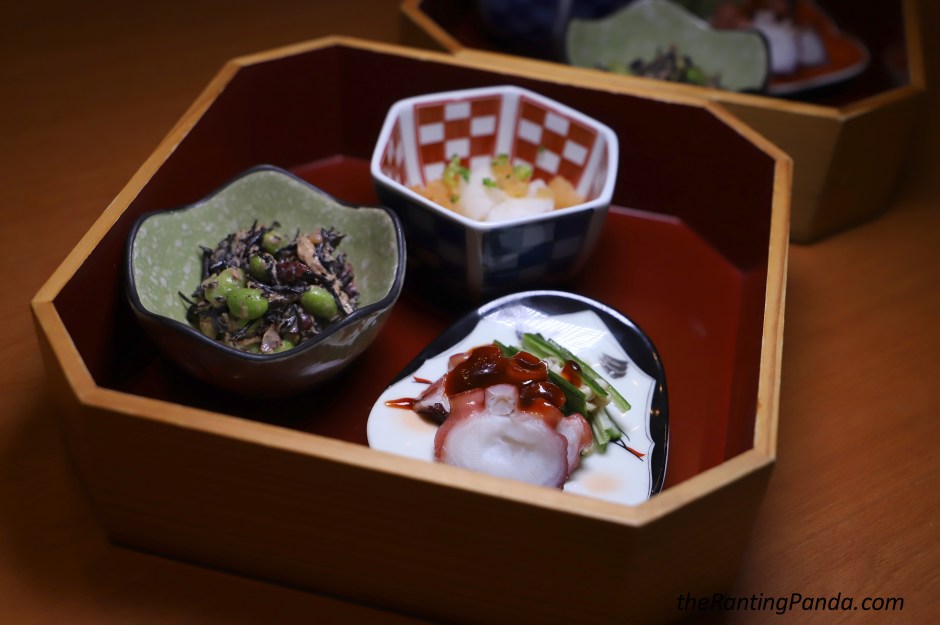 Next up is a trio of Assorted Obanzai – Hijiki Seaweed, Tuna & Edamame; Octopus & Okra dressed with Japanese Plum Sauce; and Lotus Root Ohitashi with Minced Shrimp.