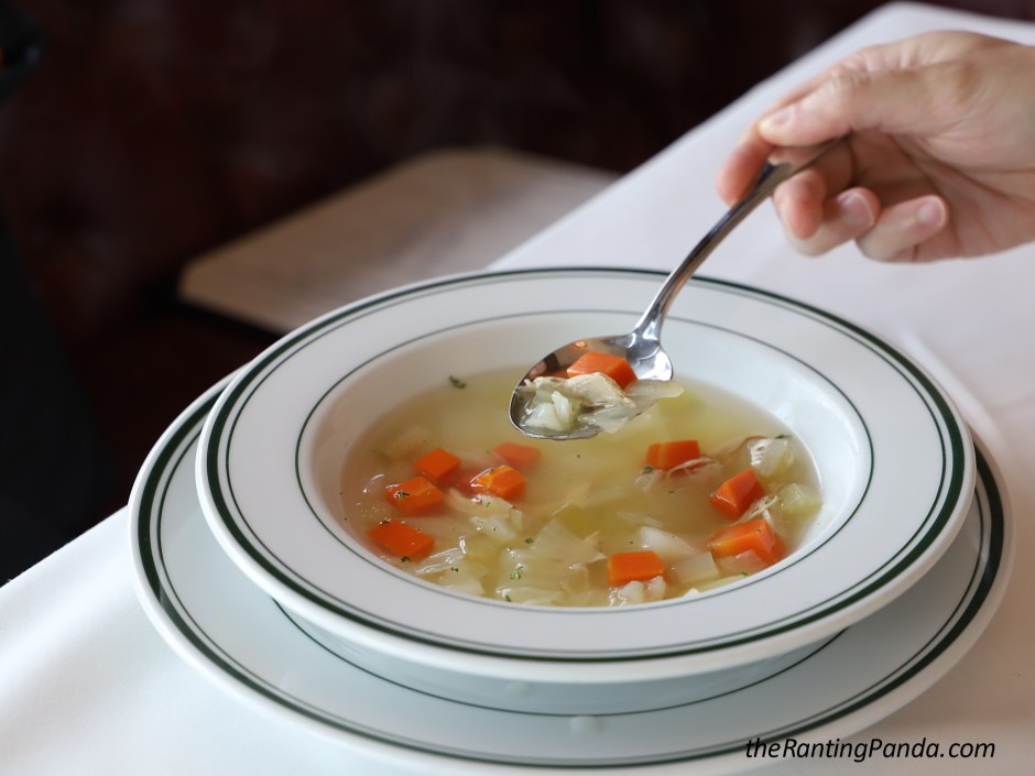 The next course is a Clear Chicken Soup with chunks of carrot, celery and cabbage.