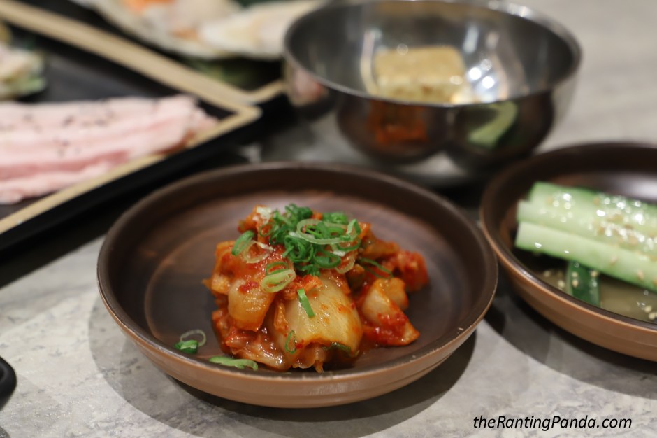 Recommending the cucumber with sesame sauce and kimchi, which aids in clearing the palate between grills.