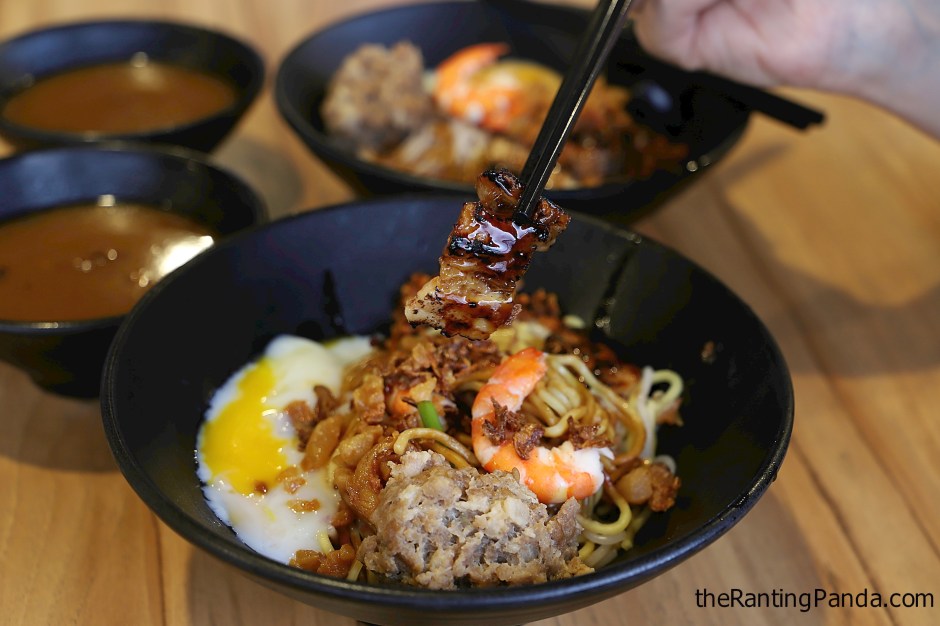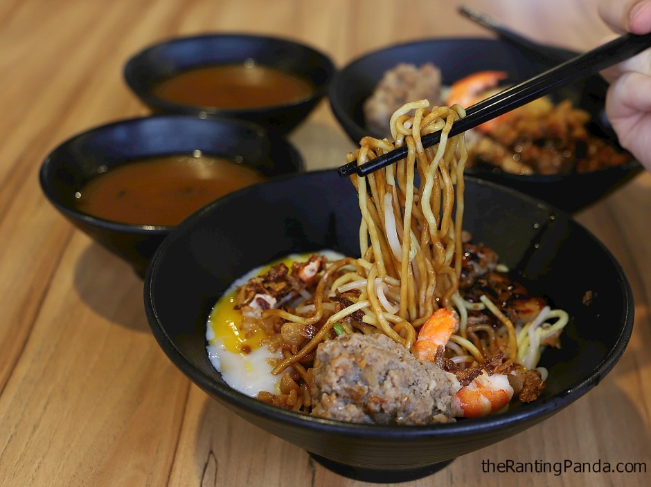 Give the noodles a good toss, mixing the black sauce, pork lards and shallots well with the noodles. The sweet sauce balances the saltiness of the prawn broth very well.
