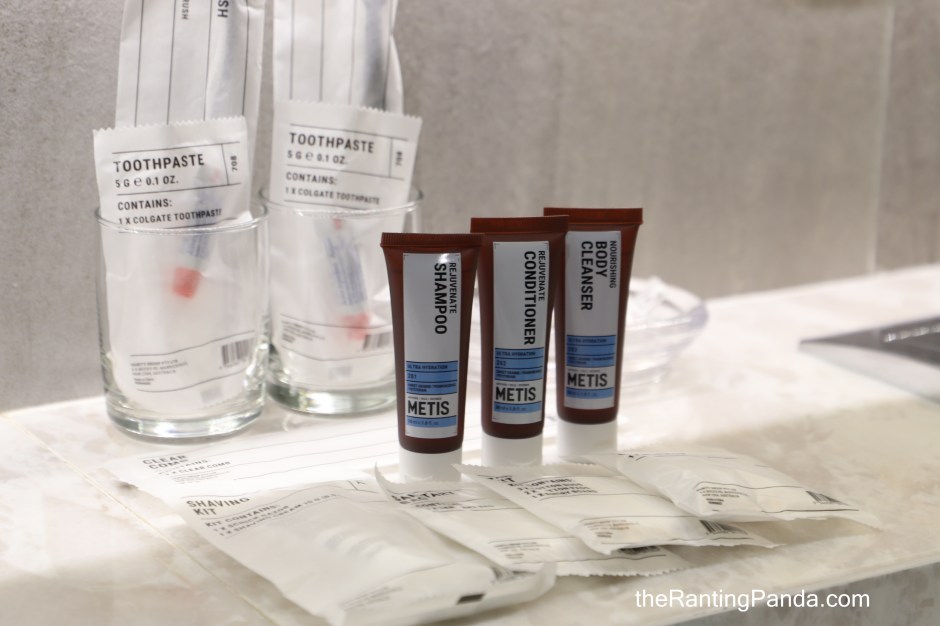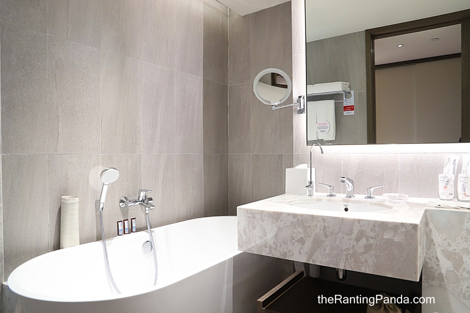 The bathroom spots a luxurious marble finishing with separate rain shower and bathtub. The rain shower is very spacious, and one other feature of the bathroom is the filtered drinking water. This also brings me to the point where no bottled water is provided in all rooms on the hotel’s part to stay green. In short, bring your own bottle for your stay here.