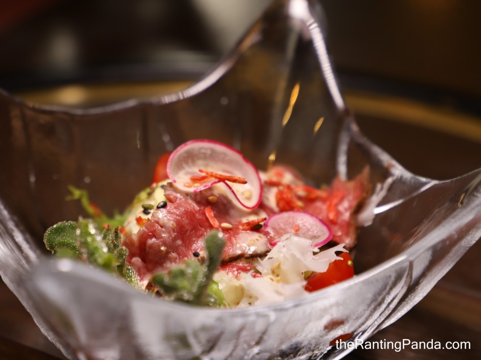 Mixed greens with Japanese wakame, Japanese white fungus, and thinly sliced Satsuma wagyu dressed in Japanese white sesame sauce and finished with sakura ebi. The highlight here is the Satsuma wagyu from Kagoshima which won first place in the Wagyu Olympics 2017.
