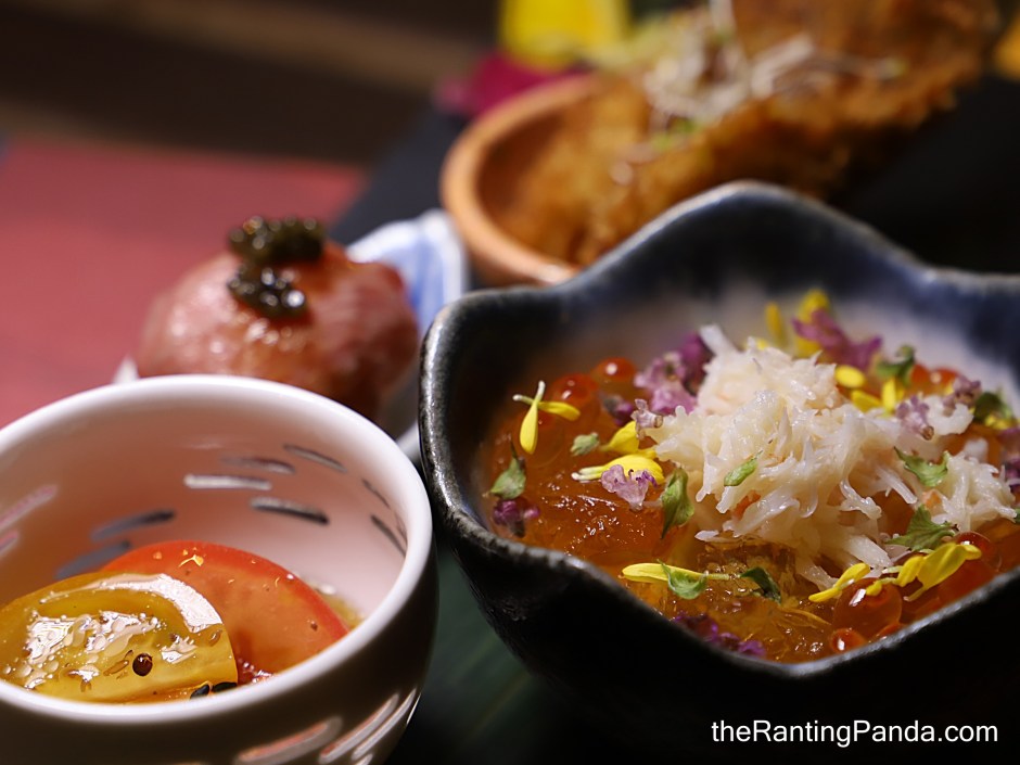 There are with 4 items here – Ohmi wagyu temari, Deep-fried hotaru ika, Kanimiso tofu dashi jelly, and Kumamoto tomatoes. Visually, it is beautiful and there is a good balance of ingredients as well.