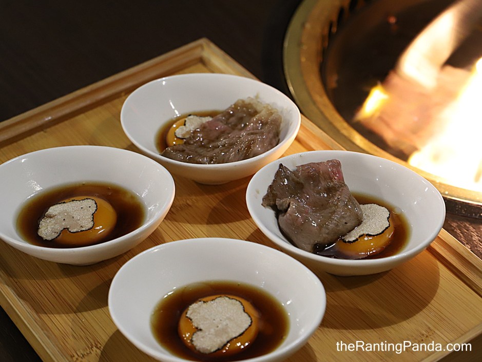 The condiments are elaborate as well, where house blended tare, housemade garlic and leek sauce, pink sea salt, freshly grated wasabi, and deep-fried garlic chips are served to complement the beef.