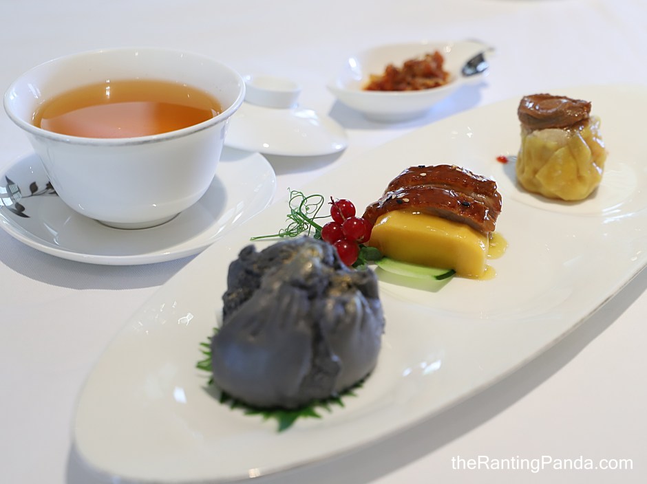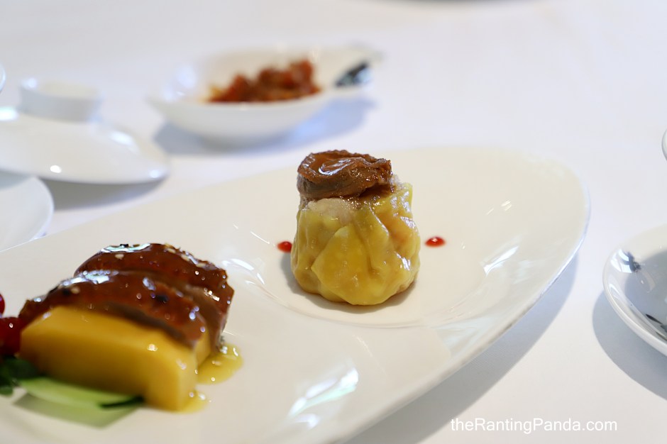 First course is a Dum Sum Platter of Steamed Siew Mai topped with Abalone, Steamed Charcoal Barbecue Arvinyo Omega 3 Pork Bun with Black Truffle, and the Boneless Roasted Duck with Fresh Mango and Lemon Sauce.