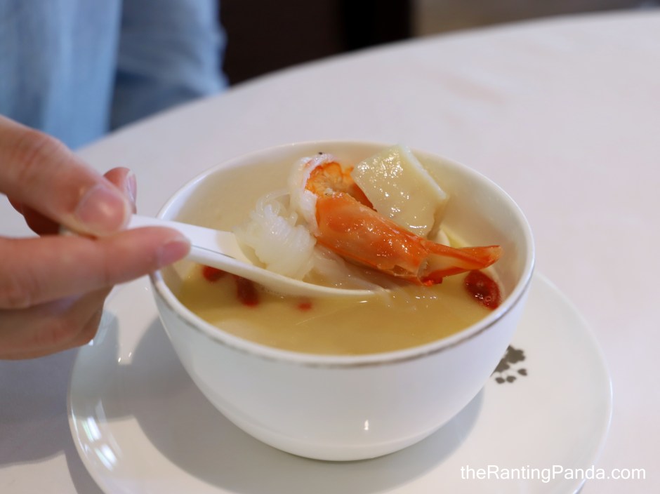 Second course is the Double-Boiled Rich Chicken Broth with Live Prawn, Scallop Bamboo Pith and Shredded Yam. This soup is very luscious, which I like.