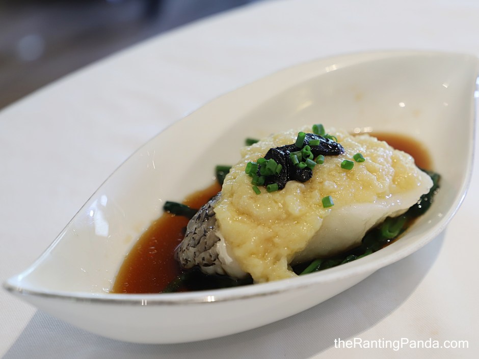 Third course is the Steamed Cod Fish with Black Garlic and Light Soya Sauce, paired with the Bai Mu Dan & Melon tea. A good rendition of cod here, where the black garlic complements the fish very well.