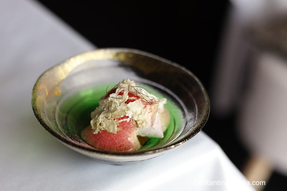 The first course is the signature amuse bouche of “Yogurt Explosion” from Gaggan’s early days. It comes in two parts, a crispy leaf decorated with spices, where the beautiful yogurt sphere then slides on the leaf and you have it all in one mouthful.